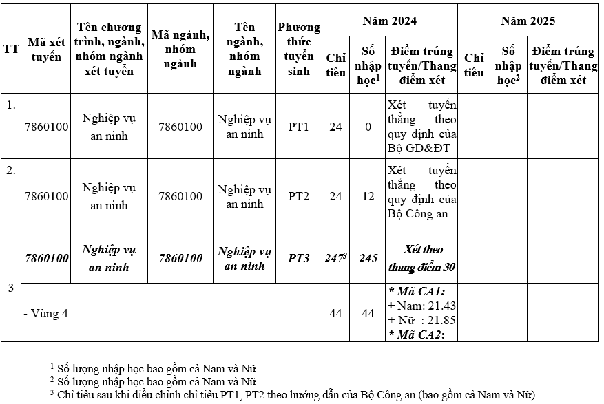 - Phương thức 1: Tuyển thẳng theo quy chế tuyển sinh hiện hành của Bộ GD&ĐT và quy định của Bộ Công an.