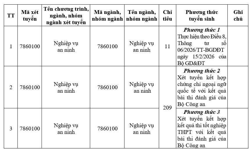 - Điều kiện xét tuyển: Thí sinh đã đạt điều kiện sơ tuyển, nộp hồ sơ đăng ký dự tuyển về các trường CAND, tham gia Bài thi đánh giá của Bộ Công an năm 2026, đăng ký nguyện vọng xét tuyển chính thức vào các trường CAND là Nguyện vọng 1, đảm bảo phân vùng tuyển sinh, đảm bảo ngưỡng đầu vào theo quy định của Bộ GD&ĐT và quy định của Bộ Công an.