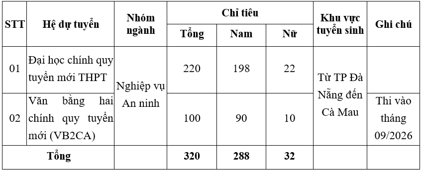 Căn cứ Quyết định số 523/QĐ-BCA-X01 ngày 30/01/2026 của Bộ trưởng Bộ Công an về phân bổ chỉ tiêu tuyển sinh (tuyển mới) cho các học viện, trường Công an nhân dân; Căn cứ Công văn số 673/X02-P2 ngày 12/02/2026 của Cục Đào tạo về một số thông tin tuyển sinh Công an nhân dân năm 2026, Trường Đại học An ninh nhân dân thông báo chỉ tiêu tuyển sinh tuyển mới năm 2026 như sau: