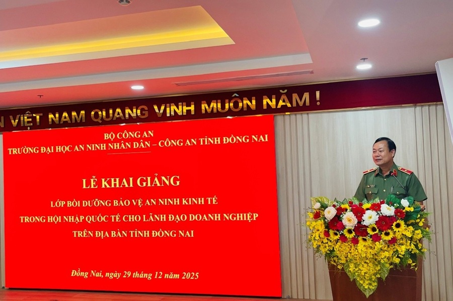 Sáng ngày 29/12/2025, Trường Đại học An ninh nhân dân đã phối hợp với Công an tỉnh Đồng Nai tổ chức lễ khai giảng lớp bồi dưỡng Bảo vệ an ninh kinh tế trong hội nhập quốc tế cho lãnh đạo doanh nghiệp trên địa bàn tỉnh Đồng Nai. Đồng chí TS, Thiếu tướng Trần Văn Tuấn - Bí thư Đảng ủy, Hiệu trưởng chủ trì buổi lễ. Tham dự buổi lễ có đồng chí Vũ Ngọc Long, Tỉnh ủy viên, Giám đốc Sở Công thương tỉnh Đồng Nai; đồng chí Nguyễn Thị Phương Thảo, Phó Giám đốc Sở Tài chính tỉnh Đồng Nai; PGS.TS, Đại tá Đặng Ngọc Toàn, Phó Hiệu trưởng Trường Đại học An ninh nhân dân; các đồng chí đại diện lãnh đạo các đơn vị chức năng của Trường Đại học An ninh nhân dân và Công an tỉnh Đồng Nai cùng toàn thể 70 học viên là lãnh đạo các doanh nghiệp; lãnh đạo các đơn vị, phụ trách các bộ phận thuộc doanh nghiệp trên địa bàn tỉnh Đồng Nai.