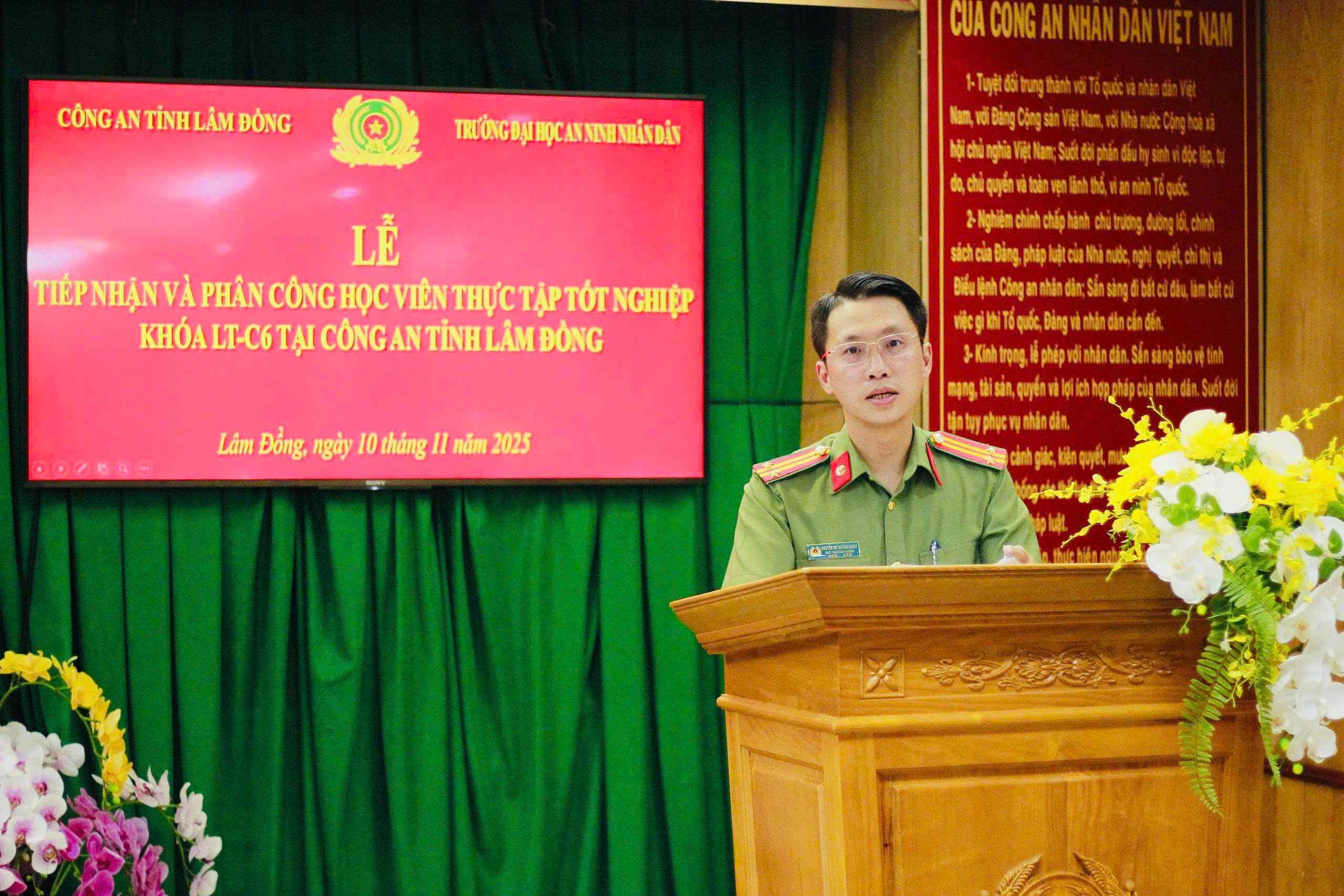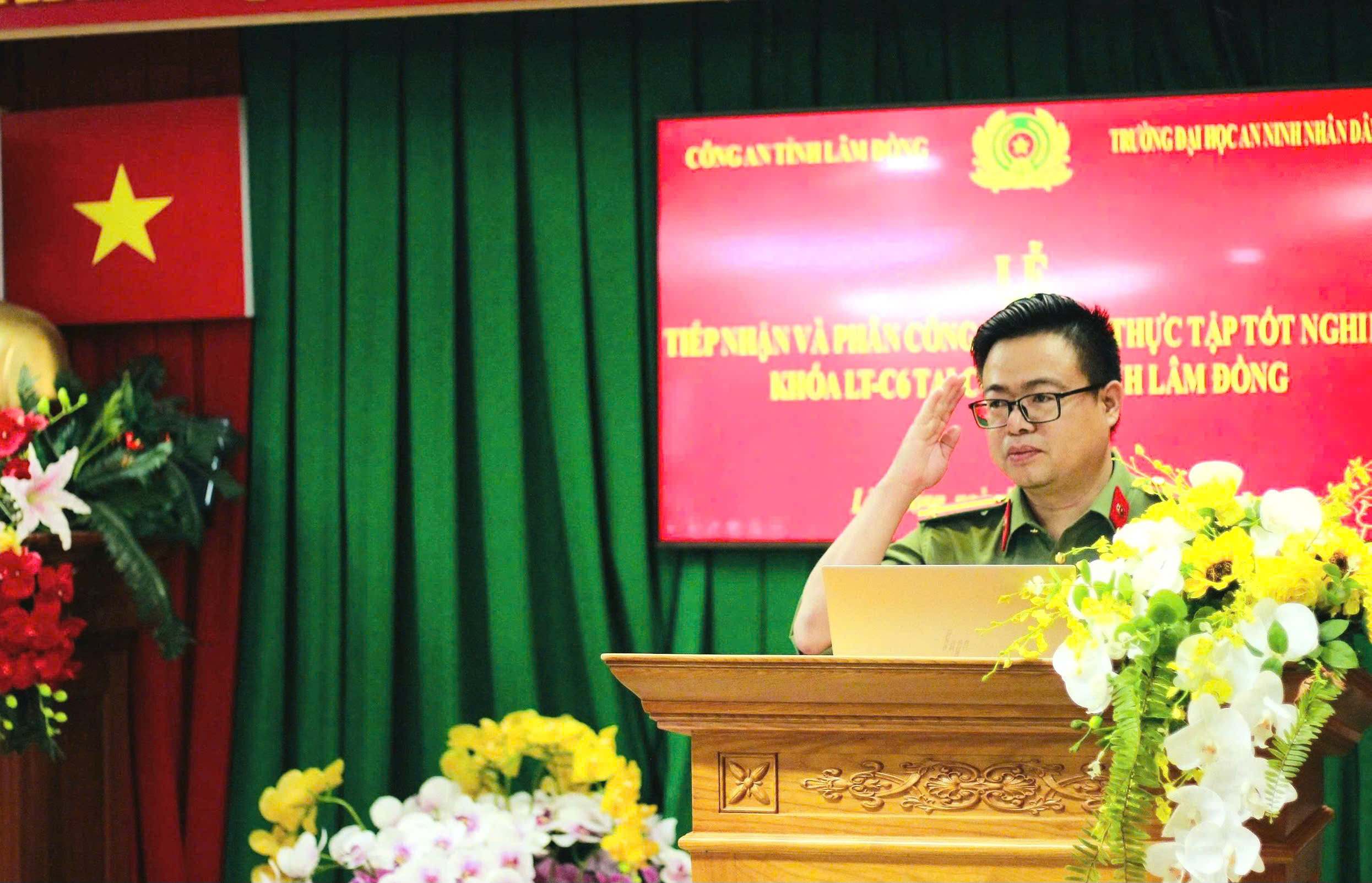 Tại buổi lễ, đại diện Công an tỉnh Lâm Đồng, đồng chí Trung tá Nguyễn Trí Trường Giang phát biểu khẳng định: Lãnh đạo Công an tỉnh Lâm Đồng luôn quan tâm, tạo điều kiện thuận lợi nhất để học viên Nhà trường hoàn thành chỉ tiêu, nhiệm vụ thực tập. Đồng chí yêu cầu học viên chấp hành nghiêm điều lệnh Công an nhân dân, quy định của Công an tỉnh Lâm Đồng đơn vị thực tập tốt nghiệp, trao dồi phẩm chất, lối sống chuẩn mực, tận dụng tốt thời gian thực tập để học hỏi, rèn luyện.