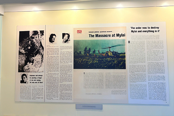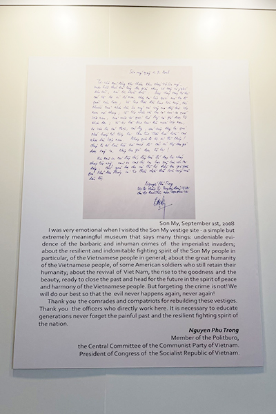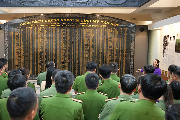 Chiều cùng ngày, lớp được đến tham quan Khu di tích vụ thảm sát Mỹ Lai (Sơn Mỹ), do quân đội Mỹ gây ra vào ngày 16/3/1968 đối với 504 dân thường xã Sơn Tịnh, tỉnh Quảng Ngãi, trong chiến tranh xâm lược Việt Nam. Tận mắt chứng kiến những hình ảnh chân thực về các hình thức tra tấn, giết người dã man mà nhóm sỹ quan, binh lính Mỹ thực hiện với đối tượng chủ yếu là người già, phụ nữ, trẻ em, thậm chí là các thai nhi còn trong bụng mẹ, do chính một phóng viên chiến trường của Mỹ ghi lại, gìn giữ và công khai trước công luận năm 1969; giảng viên, học viên lớp học không kìm được sự xúc động mạnh mẽ. Tất cả đều thấm thía lời căn dặn của cố Tổng Bí thư Nguyễn Phú Trọng đang được lưu lại tại Bảo tàng Sơn Mỹ: Đây là “bằng chứng không thể chối cãi về tội ác dã man, không còn tính người của bọn đế quốc xâm lược; về tinh thần đấu tranh kiên cường, bất khuất của nhân dân Sơn Mỹ nói riêng, của đồng bào Việt Nam nói chung; về tính nhân văn cao cả của con người Việt Nam, của một số người lính Mỹ còn giữ được tính nhân đạo; về sự hồi sinh của đất nước Việt Nam, sự vươn lên của cái thiện, cái đẹp, sẵn sàng khép lại quá khứ, hướng tới tương lai theo tinh thần hoà hiếu của nhân dân Việt Nam. Nhưng quên đi tội ác thì không! Chúng ta sẽ làm hết sức mình để cái ác không bao giờ được xảy ra, không bao giờ được trở lại...”.