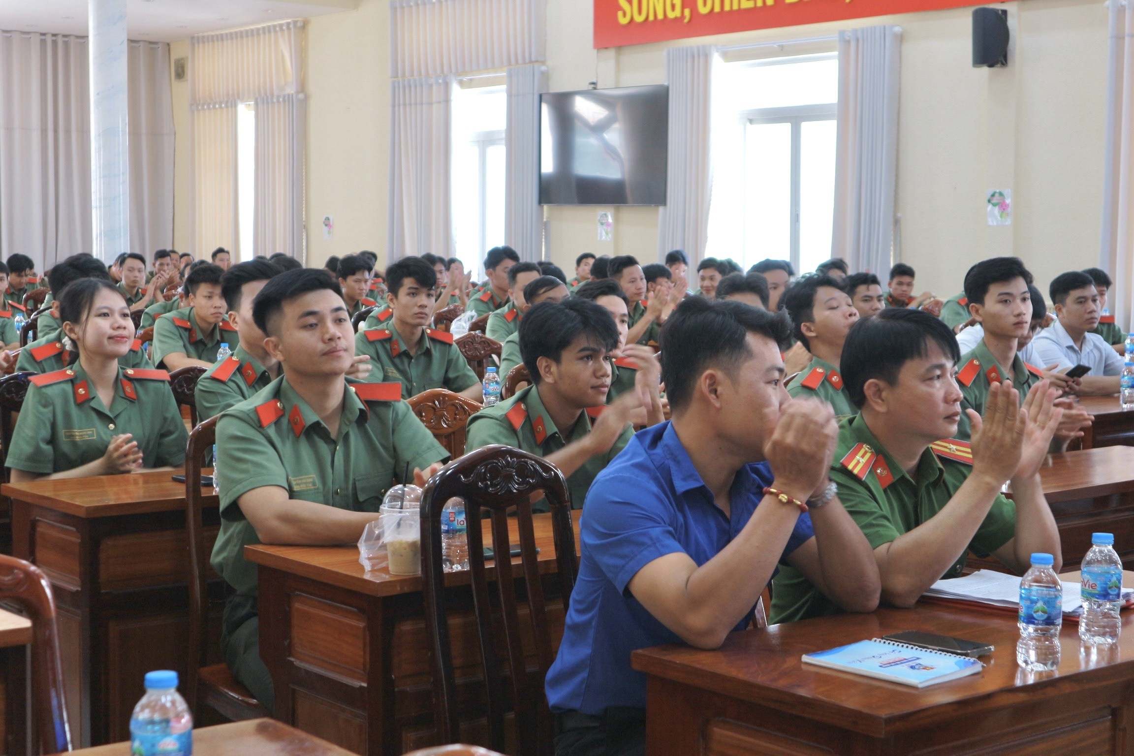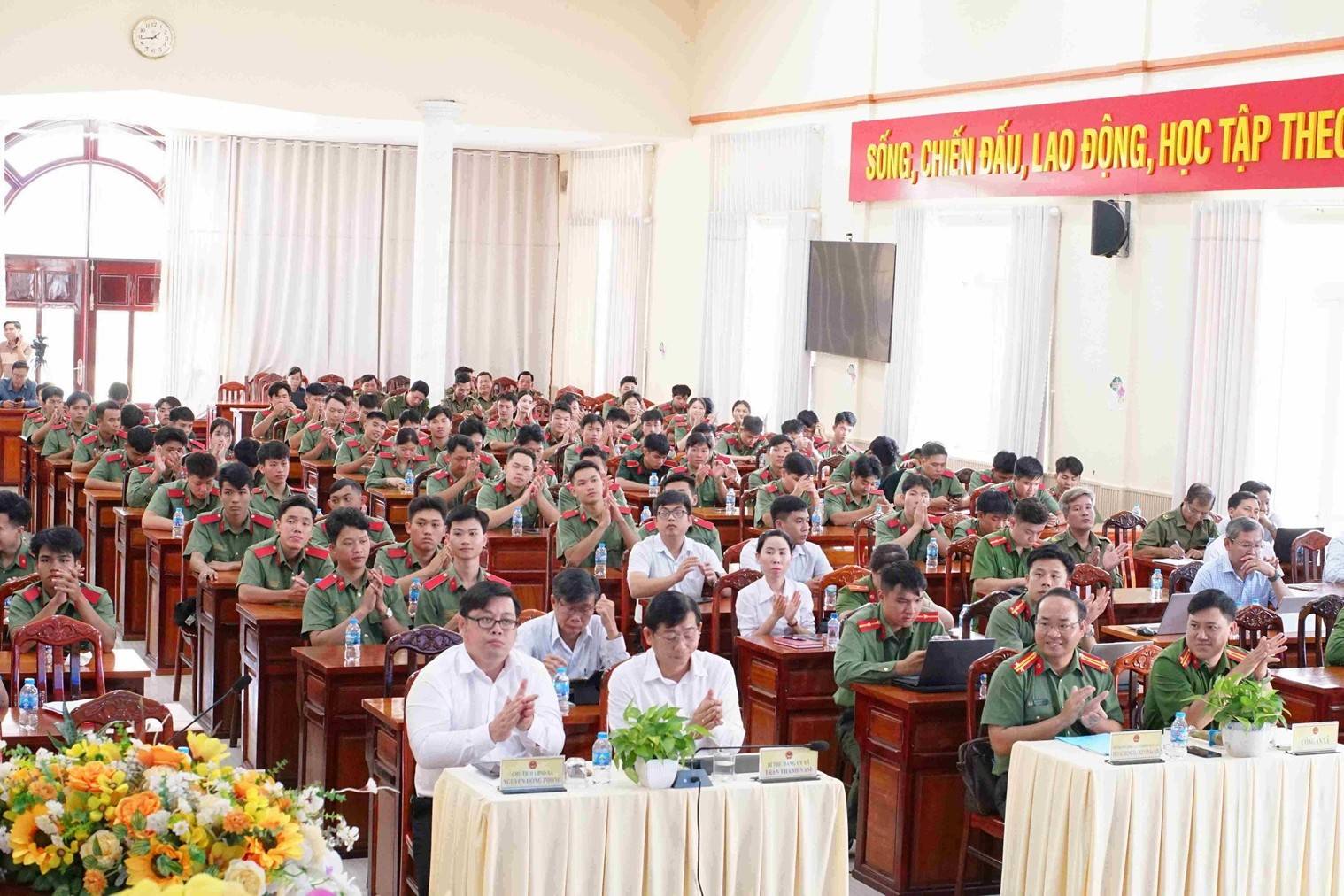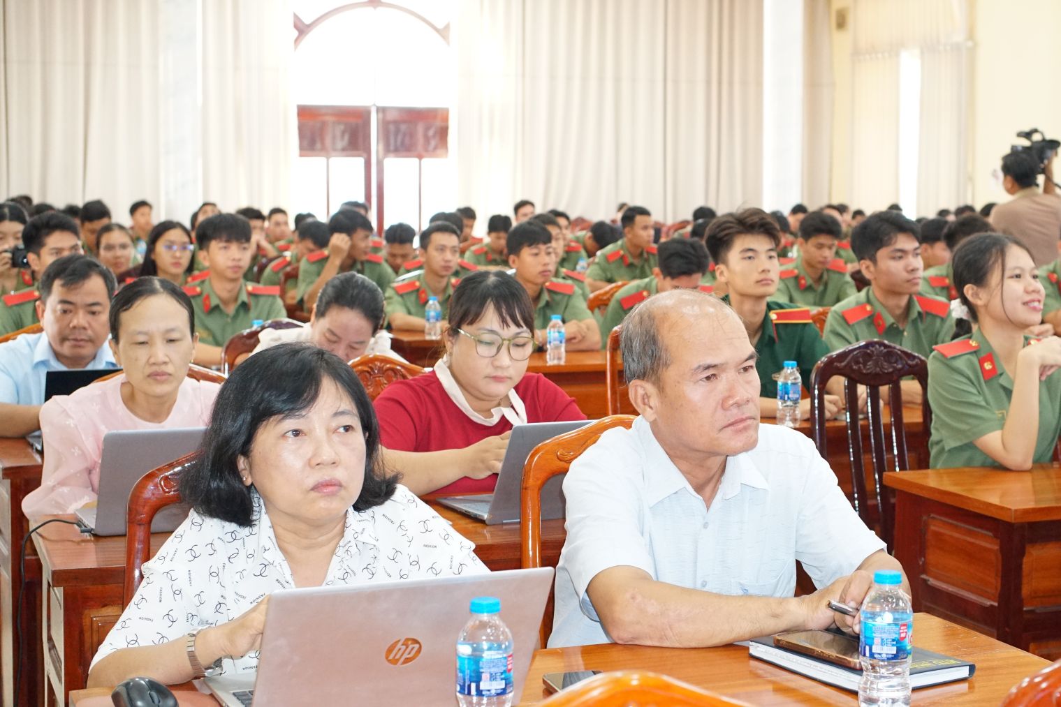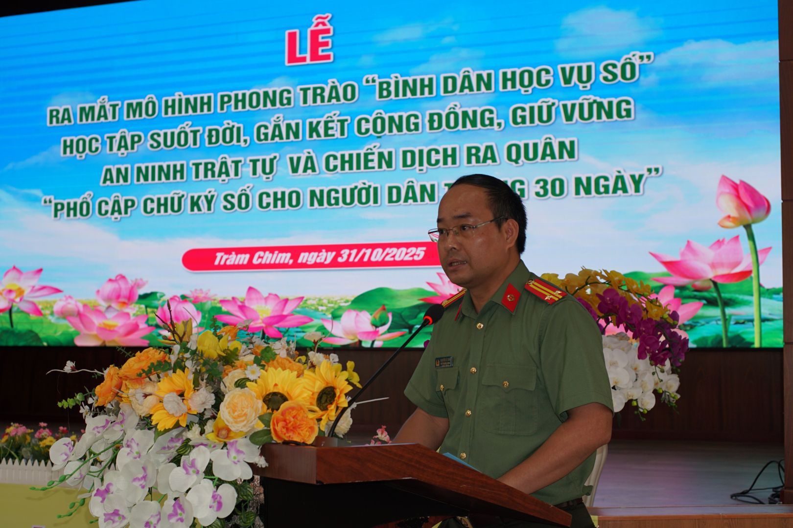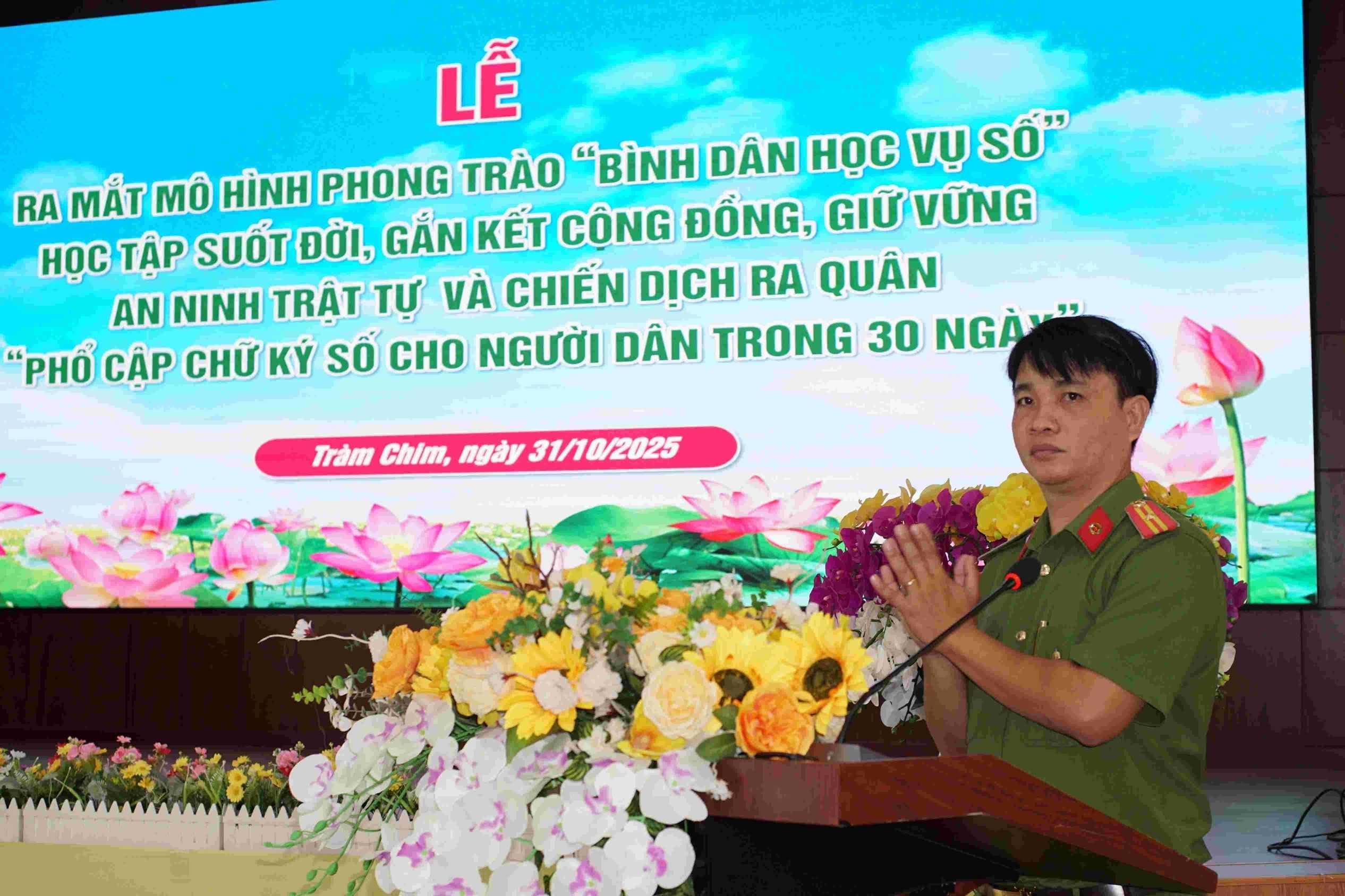 Phát biểu tại buổi lễ, TS, Trung tá Nguyễn Bá Sơn - Phó Trưởng khoa, Khoa Lý luận chính trị và Khoa học xã hội nhân văn nhấn mạnh: Mô hình “Phong trào Bình dân học vụ số - Học tập cộng đồng, phát triển kỹ năng số, giữ vững an ninh cơ sở” là sáng kiến mang ý nghĩa chính trị, nhân văn sâu sắc, thể hiện rõ sự sáng tạo trong tư duy lãnh đạo, điều hành của cấp ủy Đảng, chính quyền địa phương xã Tràm Chim, không chỉ góp phần phát triển kinh tế - xã hội, mà còn giúp Nhân dân trên địa bàn nâng cao khả năng tự bảo vệ trước các nguy cơ tội phạm mạng, thông tin xấu độc và các hình thức lừa đảo tinh vi trên môi trường số. Đây là minh chứng cho hiệu quả của mô hình kết hợp giữa Nhà trường với chính quyền cơ sở trong công tác dân vận, tuyên truyền pháp luật và chuyển đổi số cộng đồng. Khoa Lý luận chính trị và Khoa học xã hội nhân văn sẽ đồng hành cùng địa phương trong công tác tuyên truyền, bồi dưỡng kỹ năng số, hỗ trợ xây dựng tài liệu, học liệu số và phát triển mô hình chuyển đổi số cộng đồng, góp phần gắn kết giữa lý luận và thực tiễn, giữa Nhà trường và cơ sở trong công tác dân vận, chuyển đổi số và bảo đảm an ninh, trật tự.