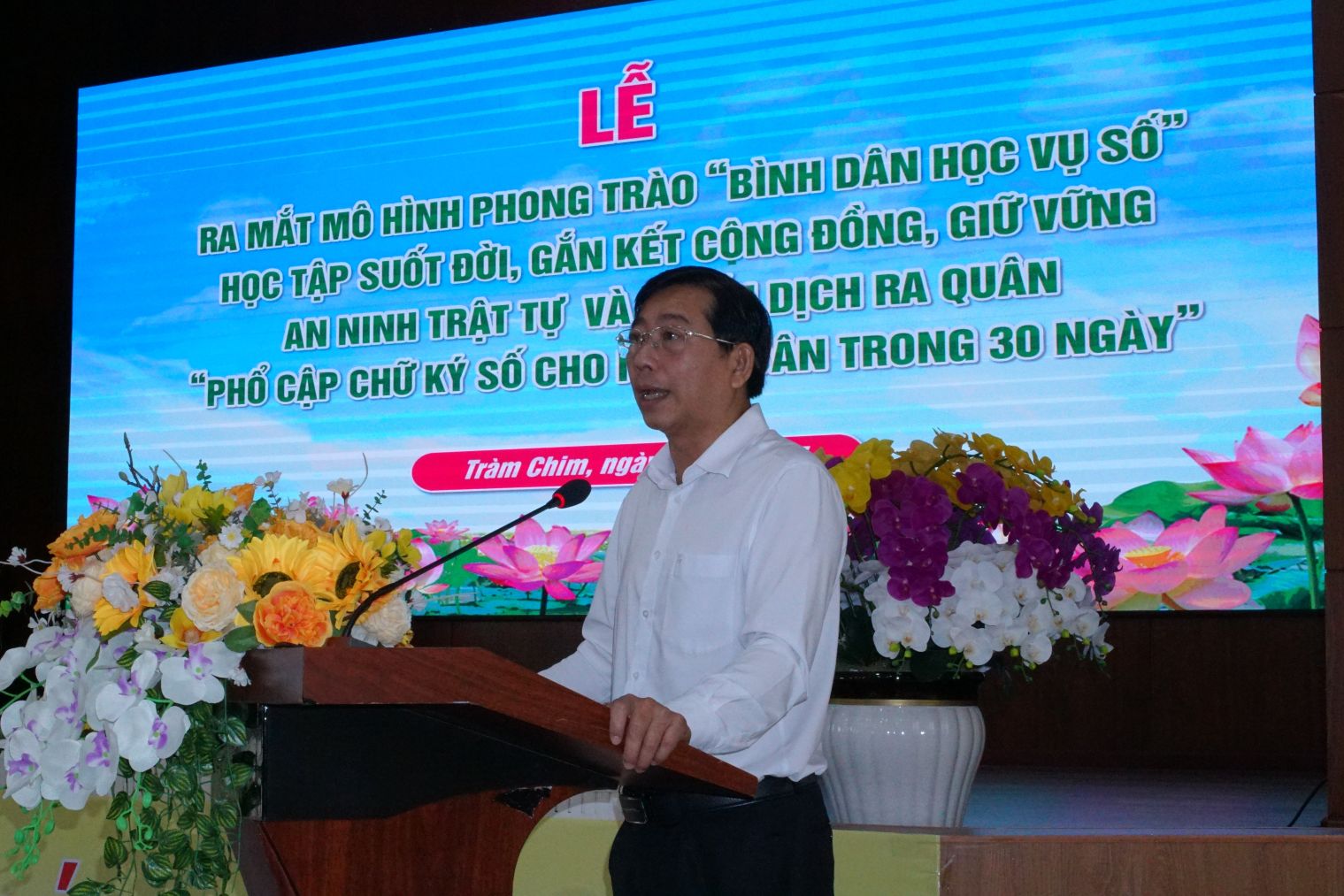 Phát biểu chỉ đạo buổi ra mắt Mô hình, đồng chí Trần Thanh Nam - Bí thư Đảng ủy, Chủ tịch Hội đồng nhân dân xã Tràm Chim khẳng định việc xây dựng và ra mắt mô hình “Phong trào Bình dân học vụ số - Học tập suốt đời, gắn kết cộng đồng, giữ vững an ninh trật tự” là bước đi sáng tạo, thể hiện tinh thần dám nghĩ, dám làm của địa phương trong gắn kết công tác chuyển đổi số với nhiệm vụ bảo đảm an ninh, trật tự. Đồng chí đánh giá cao sự phối hợp giữa chính quyền xã, các đoàn thể và Khoa Lý luận chính trị và Khoa học xã hội nhân văn trong việc đưa công nghệ đến gần với người dân. Thường trực Đảng ủy đề nghị các lực lượng tiếp tục phát huy tinh thần trách nhiệm, triển khai hiệu quả mô hình, góp phần xây dựng xã Tràm Chim trở thành xã học tập, xã số, xã an toàn và phát triển nhanh, bền vững.