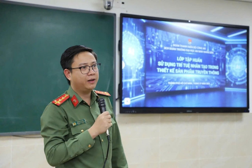 Ảnh: đồng chí Đại uý Hồ Văn Phong - Ủy viên Ban Thanh niên CAND, Bí thư Đoàn Trường Đại học An ninh nhân dân trực tiếp tập huấn, truyền đạt nội dung “Sử dụng trí tuệ nhân tạo trong thiết kế sản phẩm truyền thông hiện đại” cho sinh viên.