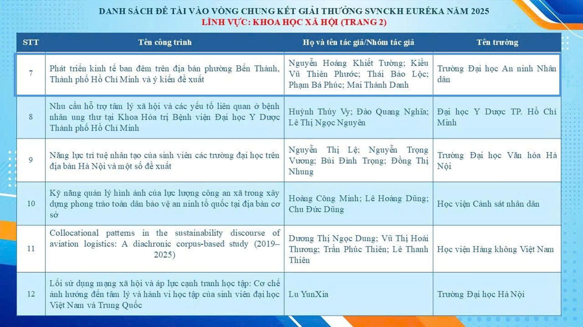 Sau quá trình chấm chọn nghiêm túc, công tâm và khách quan, Hội đồng khoa học đã quyết định chọn 12 đề tài tiêu biểu nhất bước vào Vòng Chung kết Giải thưởng Sinh viên Nghiên cứu khoa học - Euréka lần thứ XXVII, năm 2025. Đáng chú ý, trong số các công trình được chọn, đề tài “Phát triển kinh tế ban đêm trên địa bàn phường Bến Thành, Thành phố Hồ Chí Minh và ý kiến đề xuất” của nhóm sinh viên Trường Đại học An ninh nhân dân, gồm các học viên: Nguyễn Hoàng Khiết Tường, Kiều Vũ Thiên Phước (Trung đội D31A4),Thái Bảo Lộc, Phạm Bá Phúc, Mai Thành Danh (Trung đội LT-T16C), dưới sự hướng dẫn của ThS. Đại úy Nguyễn Thanh Hà - Giảng viên Khoa An ninh điều tra, đã đạt điểm số thuộc nhóm cao nhất trong Vòng Bán kết và được Hội đồng khoa học đánh giá cao về tính ứng dụng thực tiễn, tính khoa học và giá trị xã hội của đề tài, qua đó thể hiện năng lực nghiên cứu chuyên sâu, sáng tạo và quá trình trau dồi, học hỏi nghiêm túc của sinh viên Trường Đại học An ninh nhân dân.