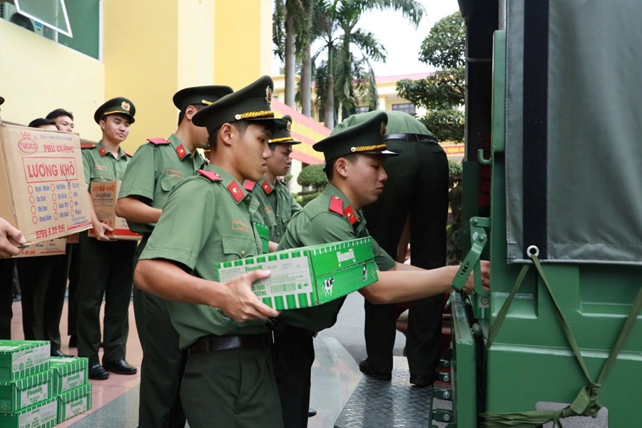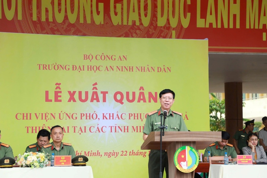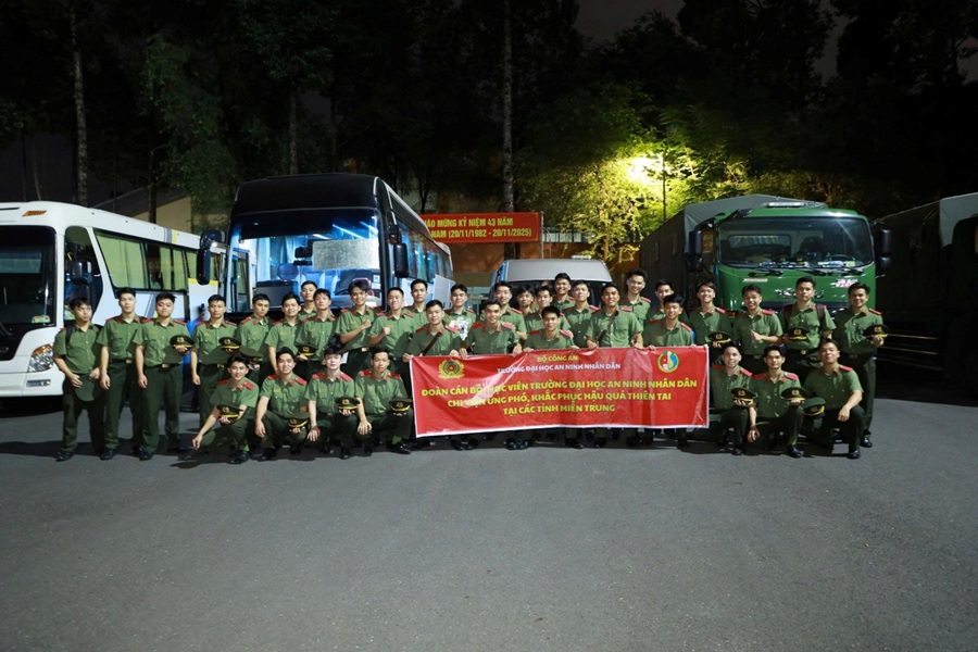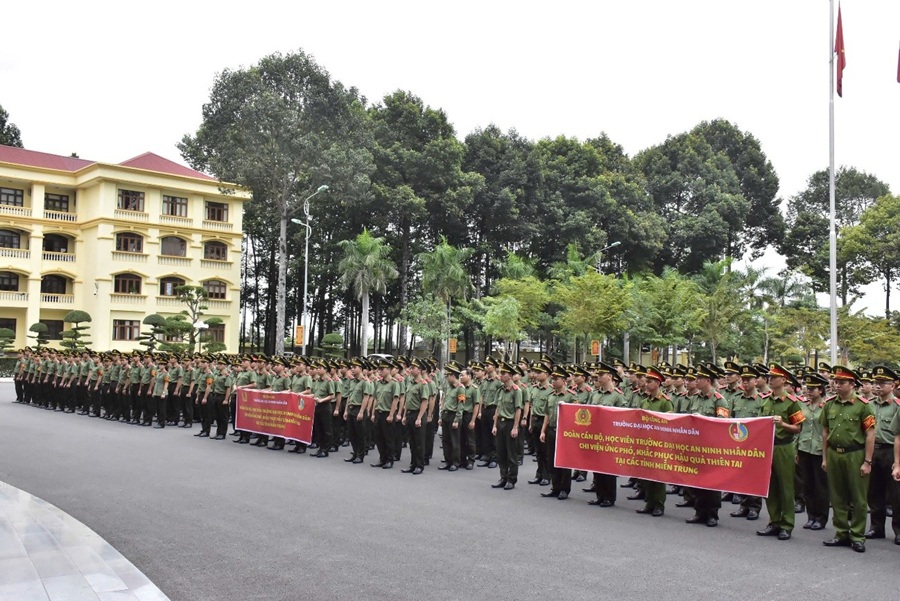 Lễ xuất quân chi viện lực lượng ứng phó, khắc phục hậu quả do mưa lũ tại các tỉnh Nam Trung Bộ được tổ chức vào chiều ngày 22/11/2025, do đồng chí Đại tá Nguyễn Trần Hiếu, Phó Bí thư Đảng ủy, Phó Hiệu trưởng chủ trì, tham gia có đồng chí Đại tá Đặng Ngọc Toàn, Ủy viên BTV Đảng ủy, Phó Hiệu trưởng; đại diện lãnh đạo các đơn vị, các tổ chức quần chúng và toàn thể học viên đang ứng trực tại Trường. Lực lượng tham gia chi viện gồm các đồng chí lãnh đạo, cán bộ Phòng Quản lý học viên và 100 sinh viên thuộc lực lượng dự bị chiến đấu của Trường được trang bị đầy đủ phương tiện, thuốc men, nhu yếu phẩm... cơ động đến địa bàn các tỉnh Nam Trung Bộ với nhiệm vụ phối hợp cùng Công an địa phương tham gia khắc phục hậu quả mưa lũ, tham gia cứu trợ, giúp đỡ Nhân dân vượt qua khó khăn, sớm ổn định cuộc sống.