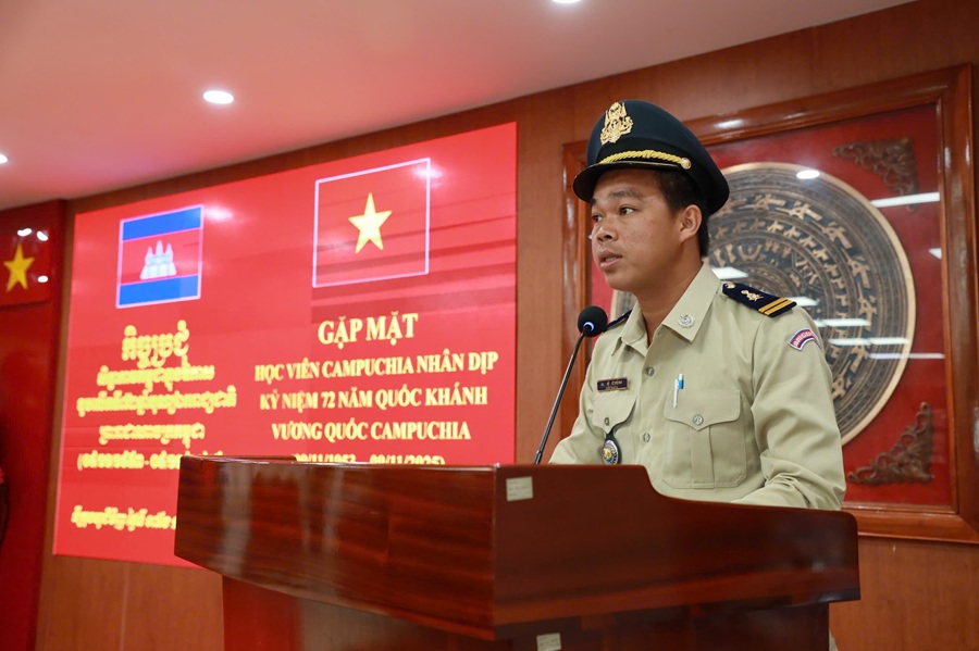 Phát biểu tại buổi lễ, Thiếu tướng Trần Văn Tuấn - Bí thư Đảng uỷ, Hiệu trưởng gửi lời chúc mừng học viên và nhân dân Campuchia; chúc mừng những thành tựu to lớn mà Nhà nước và nhân dân Campuchia đã đạt được trong 72 năm qua. Đồng thời khẳng định Việt Nam và Campuchia là hai nước láng giềng có mối quan hệ hữu nghị truyền thống, đoàn kết gắn bó, luôn ủng hộ, giúp đỡ lẫn nhau trong sự nghiệp đấu tranh giải phóng dân tộc cũng như trong công cuộc xây dựng, phát triển đất nước.