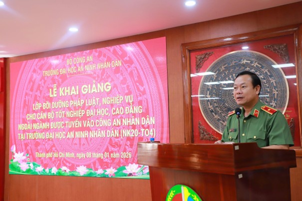 Chiều ngày 08/01/2026, Trường Đại học An ninh nhân dân tổ chức Lễ khai giảng Lớp Bồi dưỡng pháp luật, nghiệp vụ cho cán bộ tốt nghiệp Đại học, cao đẳng ngoài ngành được tuyển vào Công an nhân dân tại Trường. Đồng chí Thiếu tướng, TS. Trần Văn Tuấn - Bí thư Đảng ủy, Hiệu trưởng Nhà trường dự chỉ đạo, cùng các đồng chí trong Đảng ủy, Ban Giám hiệu, đại diện lãnh đạo các đơn vị, cán bộ, giáo viên và học viên Khóa NK20.