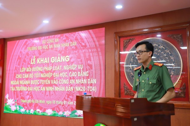 Phát biểu chỉ đạo tại buổi Lễ khai giảng, đồng chí Hiệu trưởng gửi lời chúc mừng đến toàn thể học viên khóa học chính thức trở thành học viên của trường; mong muốn học viên cần nghiêm túc thực hiện đúng lịch trình kế hoạch học tập; khắc phục khó khăn, tập trung đầu tư, tích lũy kiến thức để mở rộng tri thức cho bản thân. Đồng chí Hiệu trưởng tin tưởng rằng, dưới sự chỉ đạo sát sao của Đảng uỷ - Ban Giám hiệu, sự phối hợp chặt chẽ của các đơn vị chức năng và Công an các đơn vị, địa phương; sự nỗ lực phấn đấu của mỗi học viên cùng uy tín, bề dày kinh nghiệm tổ chức các khóa bồi dưỡng của Nhà trường, khoá học sẽ hoàn thành xuất sắc chương trình đào tạo và đạt kết quả cao nhất, đáp ứng yêu cầu công tác đào tạo, bồi dưỡng cán bộ Công an nhân dân trong tình hình mới.