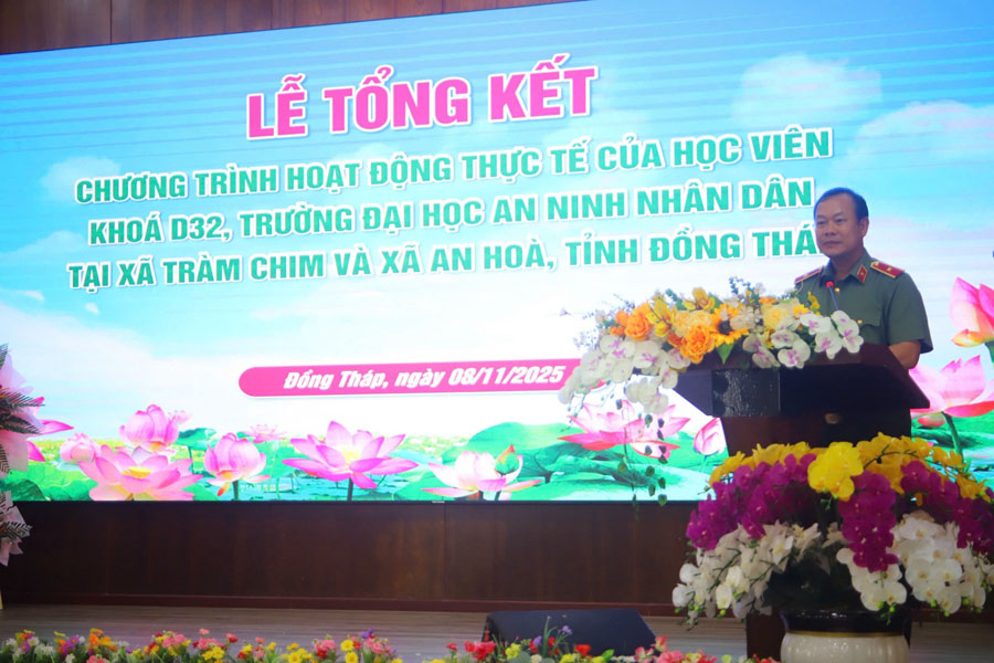 Thực hiện Kế hoạch số 2653/KH-T04-K1 ngày 08/10/2025 của Trường Đại học An ninh nhân dân về việc tổ chức hoạt động thực tế cho học viên khóa D32 tại xã An Hòa và xã Tràm Chim, tỉnh Đồng Tháp, ngày 08/11/2025, Nhà trường đã tổ chức Lễ Tổng kết hoạt động thực tế cho học viên khoá D32 tại Hội trường UBND xã Tràm Chim, tỉnh Đồng Tháp.
