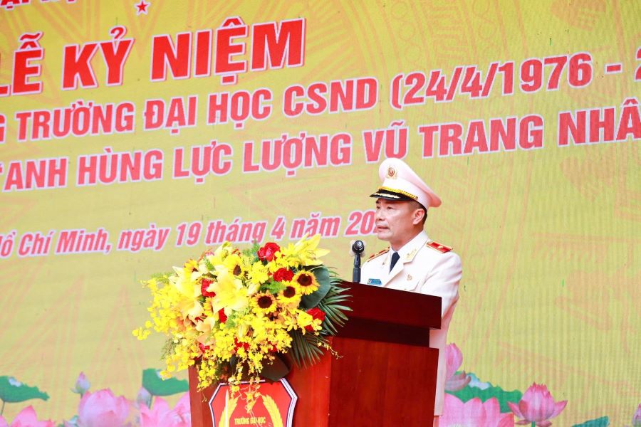 Phát biểu đáp từ, Thiếu tướng, PGS. TS. Đỗ Anh Tuấn, Hiệu trưởng Nhà trường bày tỏ lòng biết ơn sâu sắc tới Đảng, Nhà nước; Đảng ủy Công an Trung ương, lãnh đạo Bộ Công an; các Ban, Bộ, Ngành Trung ương; cấp ủy, chính quyền các địa phương; các đơn vị trong và ngoài lực lượng; bạn bè quốc tế; các thế hệ lãnh đạo, cán bộ, giảng viên, công nhân viên và học viên Nhà trường - những người đã cống hiến trí tuệ, công sức, tâm huyết, trọng đời mình cho sự hình thành, xây dựng và phát triển của Trường Đại học CSND suốt 50 năm qua.