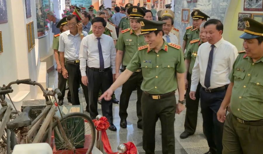Đại tướng Lương Tam Quang, Ủy viên Bộ Chính trị, Bộ trưởng Công an xem quân dụng trưng bày tại Bảo tàng Ban An ninh Trung ương Cục miền nam.