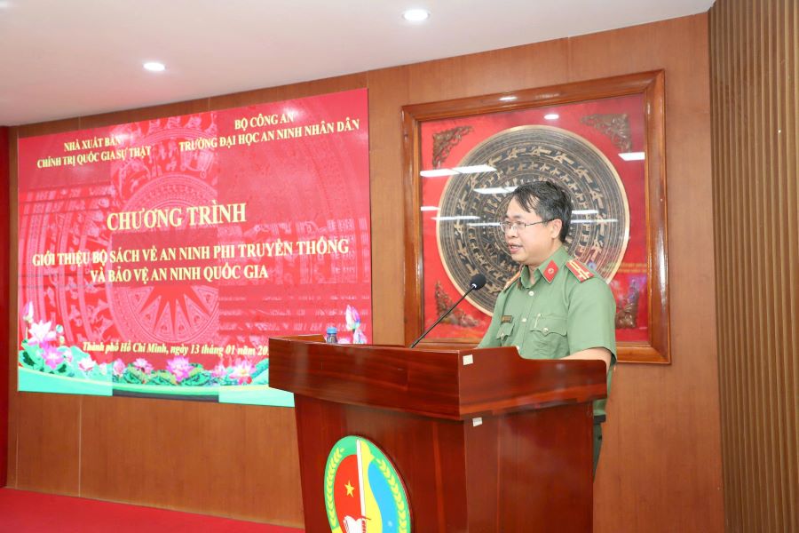 PGS, TS, Thượng tá Nguyễn Văn Chung, Phó Trưởng khoa Khoa An ninh kinh tế, Trường Đại học ANND phát biểu giới thiệu về 02 cuốn sách “Tổng quan về an ninh phi truyền thống ở Việt Nam hiện nay” và “Chủ động phòng ngừa, ứng phó với một số thách thức an ninh phi truyền thống – Mục tiêu bảo đảm an ninh con người ở Viẹt Nam hiện nay”.