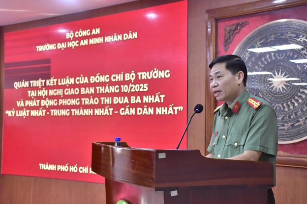 Tại Hội nghị, các đồng chí trong Ban Thường vụ Đảng ủy (đồng chí Phó Bí thư và Ủy viên Ban Thường vụ) đã quán triệt những nội dung cơ bản của Nghị quyết Đại hội đại biểu Đảng bộ Công an Trung ương lần thứ VIII, nhiệm kỳ 2025 - 2030; Kết luận của đồng chí Bộ trưởng tại Hội nghị giao ban tháng 10/2025 và phát động phong trào thi đua Ba Nhất: “Kỷ luật nhất - Trung thành nhất - Gần dân nhất”. Đây là những nội dung rất quan trọng, đòi hỏi thống nhất về nhận thức và hành động trong toàn thể đảng viên, cán bộ, giảng viên, nhân viên, học viên nhằm triển khai thực hiện có hiệu quả Nghị quyết Đại hội Đảng bộ CATW lần thứ VIII và Nghị quyết Đại hội Đảng bộ Trường Đại học ANND lần thứ XVI, nhiệm kỳ 2025 - 2030.